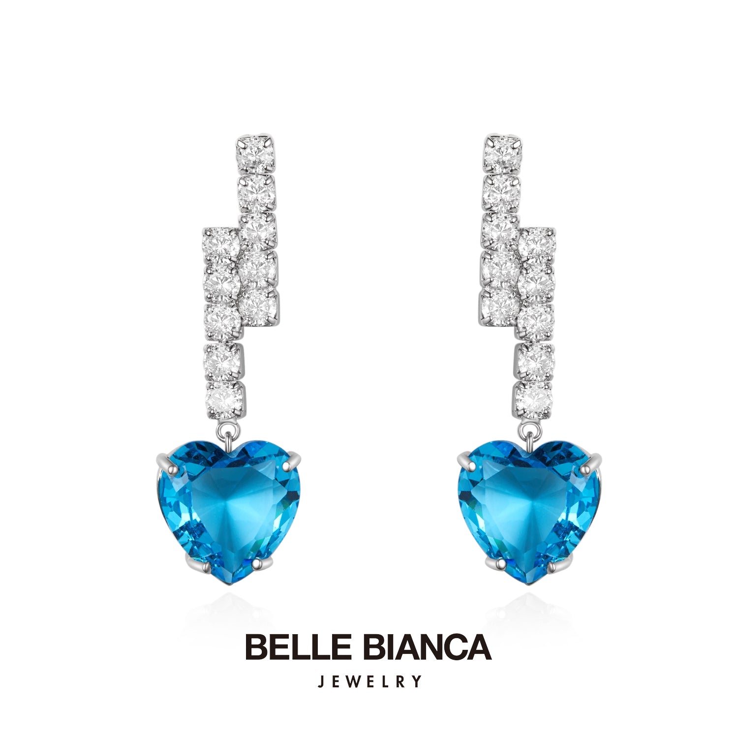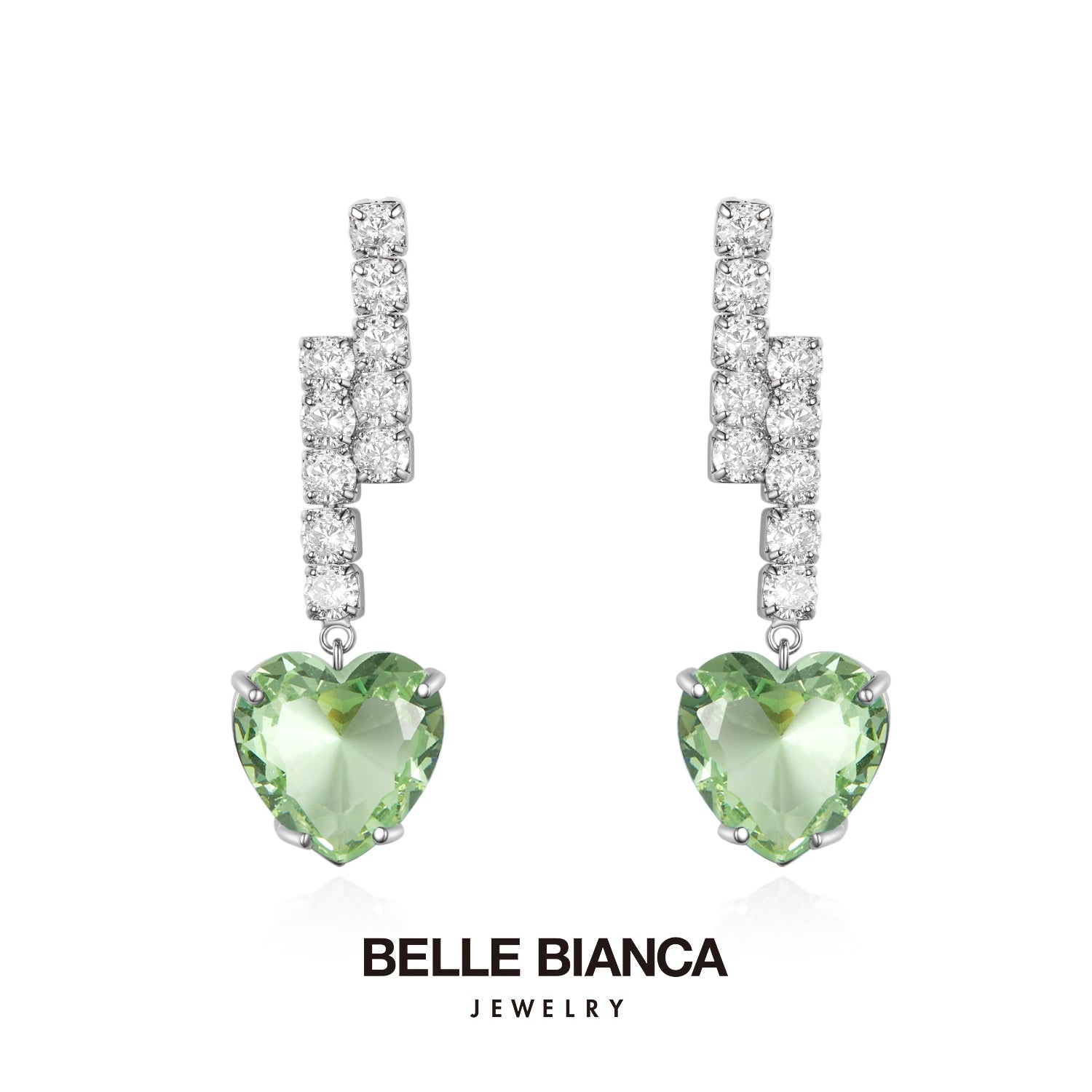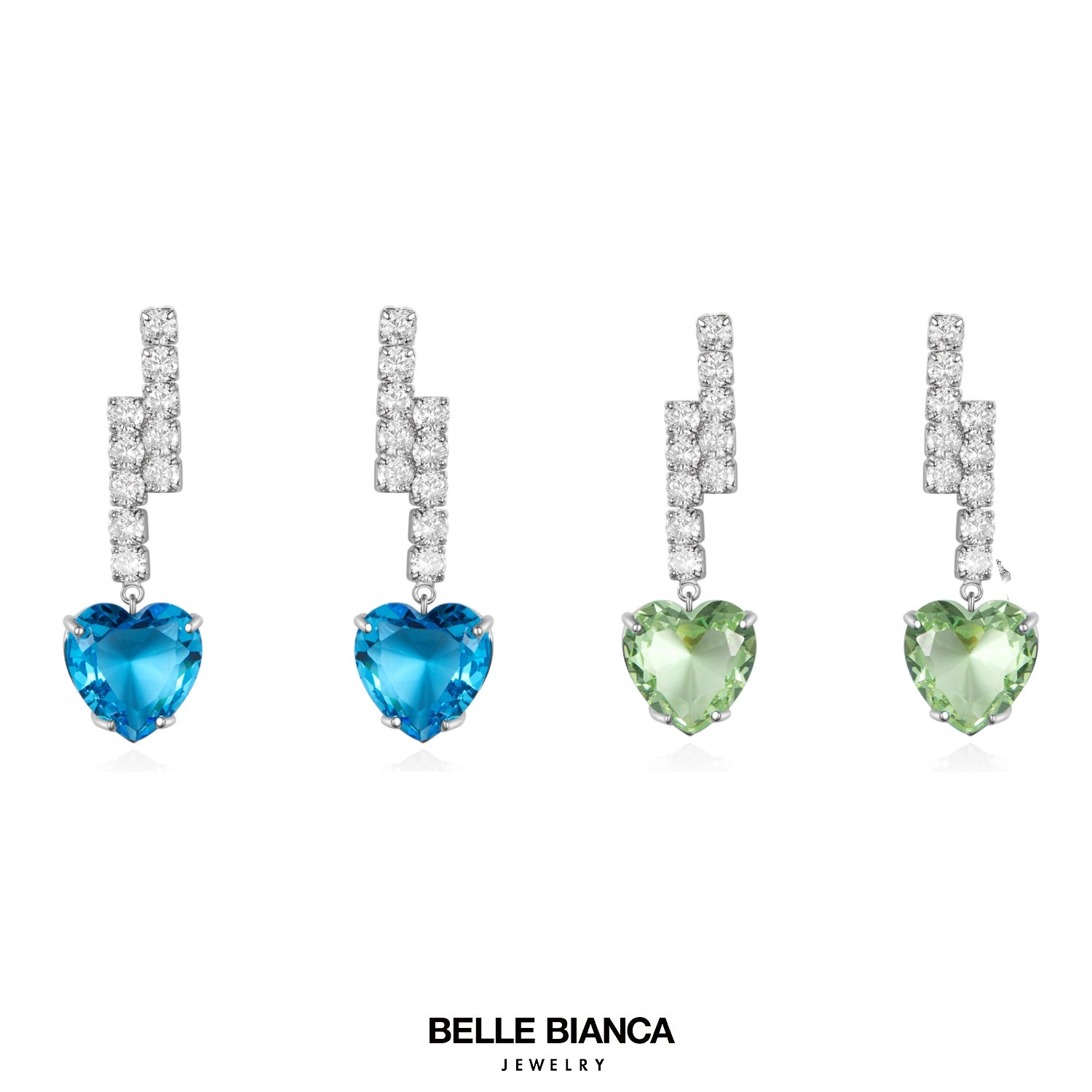 These Bellebianca earrings feature a zigzag design with sparkling diamonds and heart-shaped gemstones. Available in vibrant blue and light green, they add a pop of color while keeping an elegant, timeless look. Perfect for any occasion.
